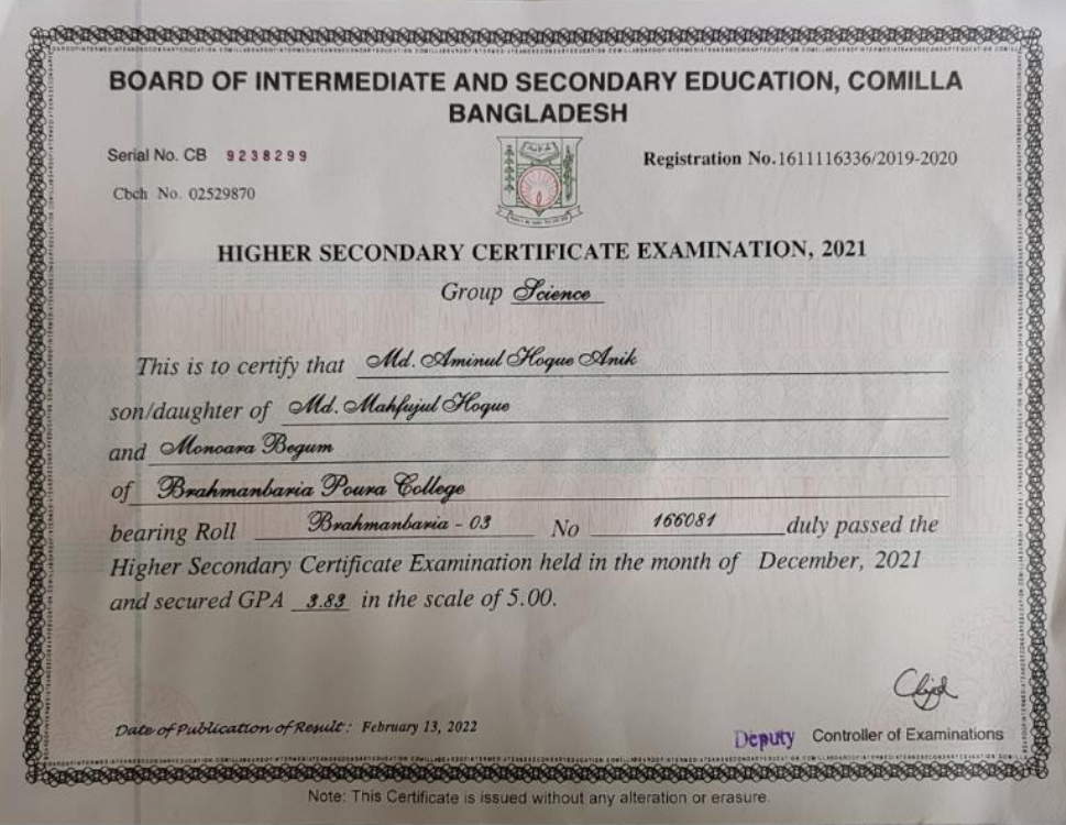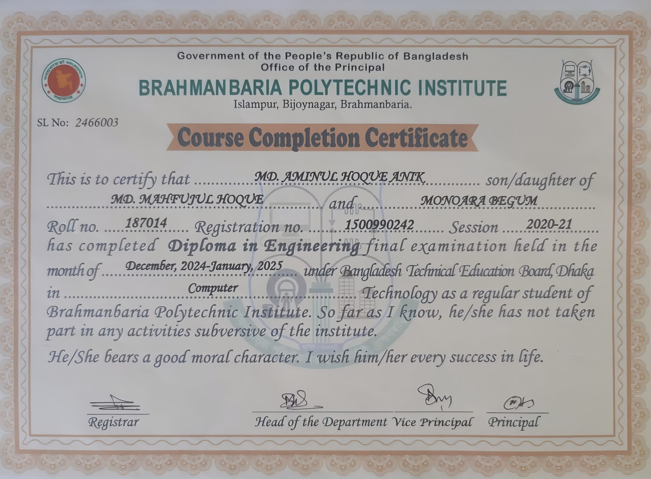 I have completed my computer science and technology course at the Brahmanbaria Polytechnic Institute of Brahmanbaria in the 2020-21 session.